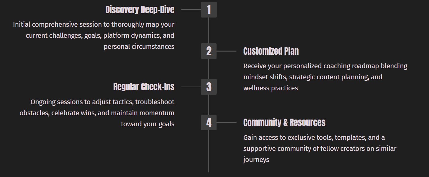 We've designed coaching specifically for influencers balancing creativity and business demands. Our experts understand the unique pressures of social media fame, brand partnerships, and audience expectations.